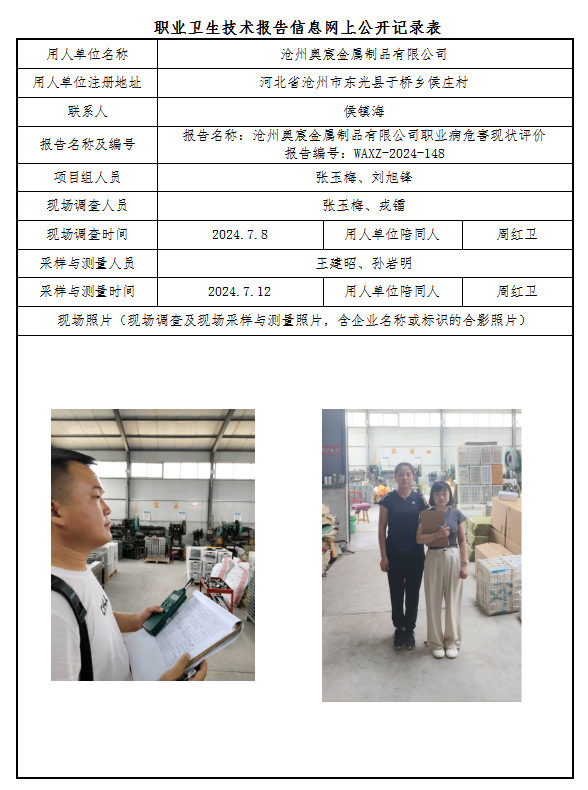 沧州奥宸金属制品有限公司职业病危害现状评价