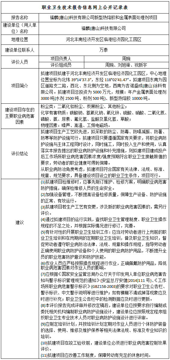 福麟(唐山)科技有限公司新型热熔胶和金属表面处理剂项目职业病危害预评价