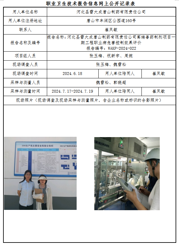 河北圣雪大成唐山制药有限责任公司高端兽药制剂项目一期工程职业病危害控制效果评价