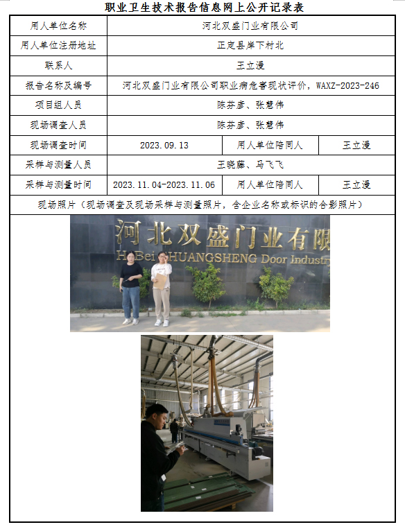 河北双盛门业有限公司职业病危害现状评价