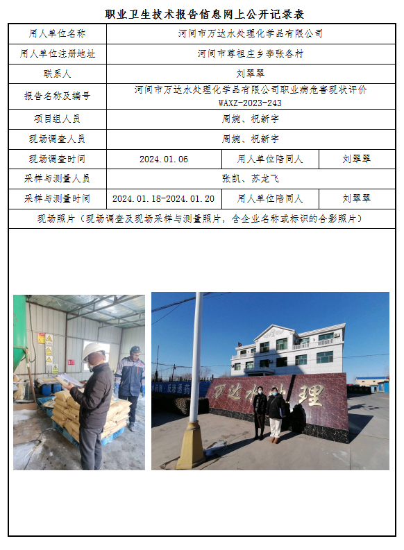 河间市万达水处理化学品有限公司职业病危害现状评价