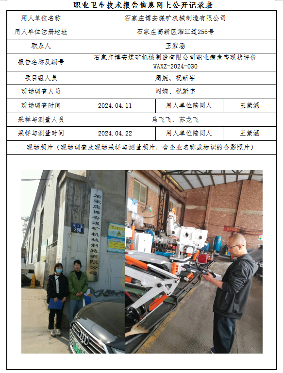 石家庄博安煤矿机械制造有限公司职业病危害现状评价