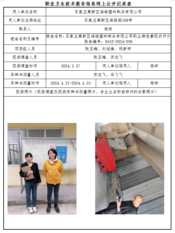 石家庄高新区鸿域塑料制品有限公司职业病危害现状评价