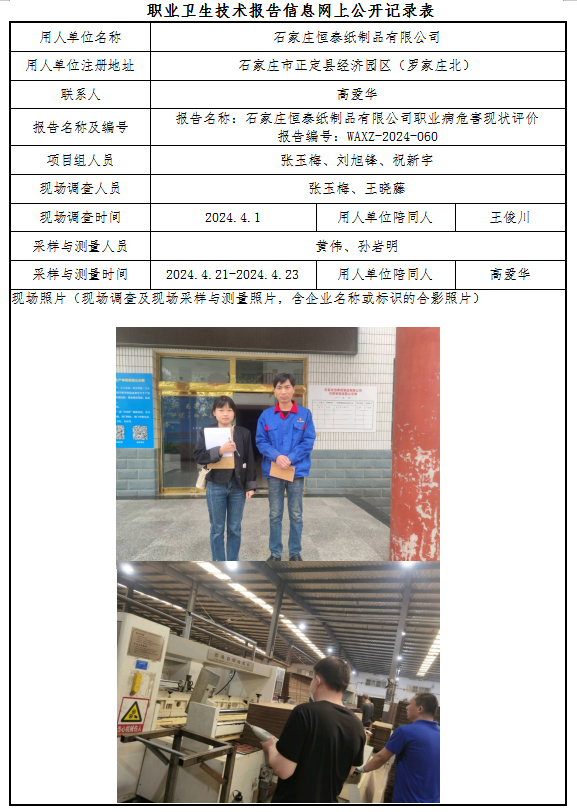 石家庄恒泰纸制品有限公司职业病危害现状评价