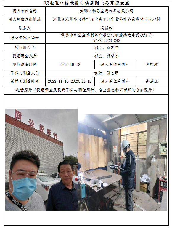 黄骅市和强金属制品有限公司 职业病危害现状评价