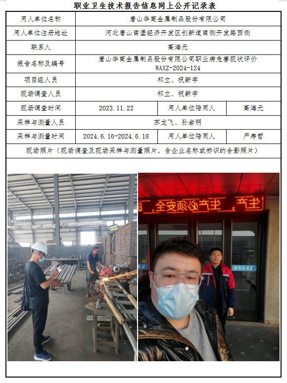 唐山华商金属制品股份有限公司 职业病危害现状评价