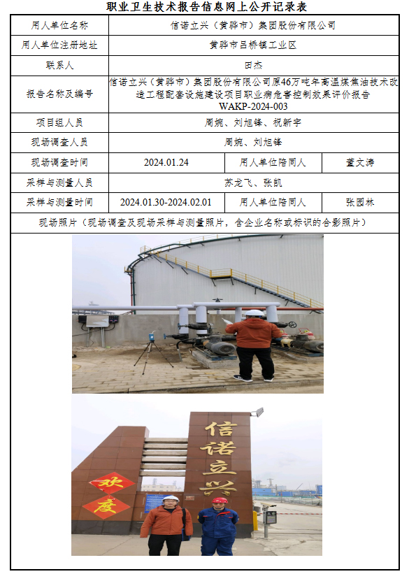信诺立兴(黄骅市)集团股份有限公司原46万吨年高温煤焦油技术改造工程配套设施建设项目职业病危害控制效果评价