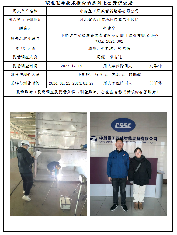 中船重工双威智能装备有限公司职业病危害现状评价