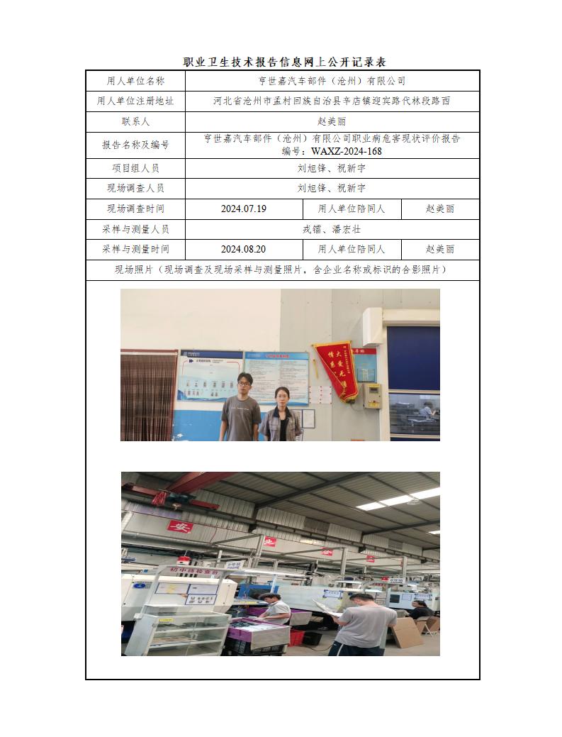 亨世嘉汽车部件(沧州)有限公司职业病危害现状评价