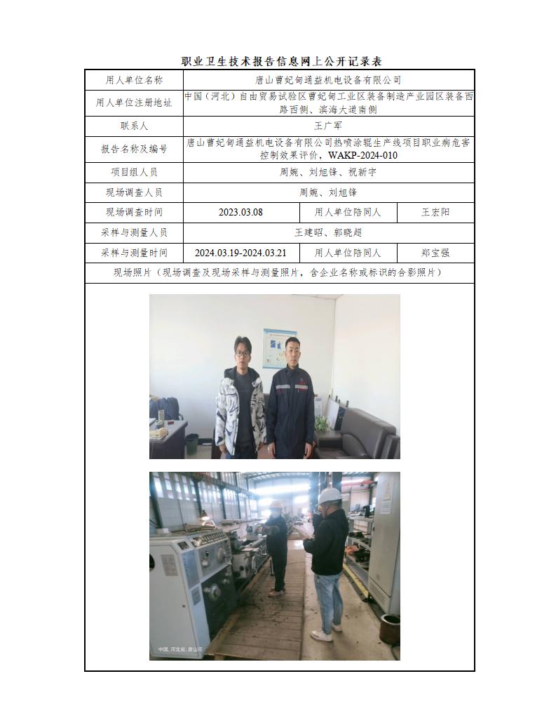 唐山曹妃甸通益机电设备有限公司热喷涂辊生产线项目职业病危害控制效果评价
