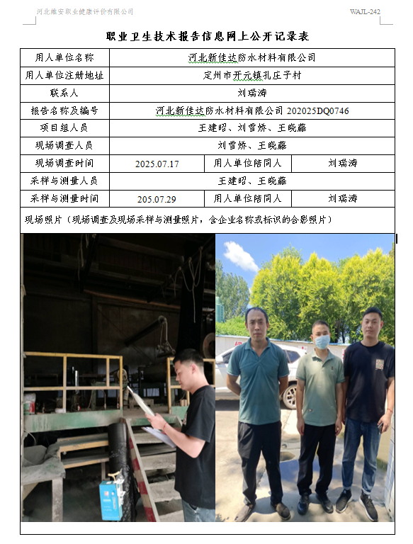 2025年河北新佳达防水材料有限公司定期检测网上公示